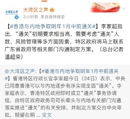 香港特區(qū)行政長官李家超于2022年12月24日表示,中央已同意香港可以與內(nèi)地逐步有序?qū)崿F(xiàn)全面“通關(guān)”。李家超表示,香港特區(qū)政府即時成立“通關(guān)”事務(wù)協(xié)調(diào)組,由特區(qū)政府政務(wù)司司長牽頭與內(nèi)地有關(guān)部門溝通落實推進(jìn)“通關(guān)”的有關(guān)安排,并制定方案交由中央審批,期望在2023年1月中之前逐步有序落實。