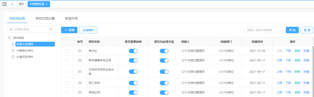2.水泥企業管理人員可在平臺進行相關方管理,設置相關方項目、單位及人員分別需提交的資料及審核內容作為準入條件,相關方單位資質及人員審核通過才能被錄入平臺,審核不通過則系統自動研判為不具備準入條件,相關方單位及人員則無法入廠。