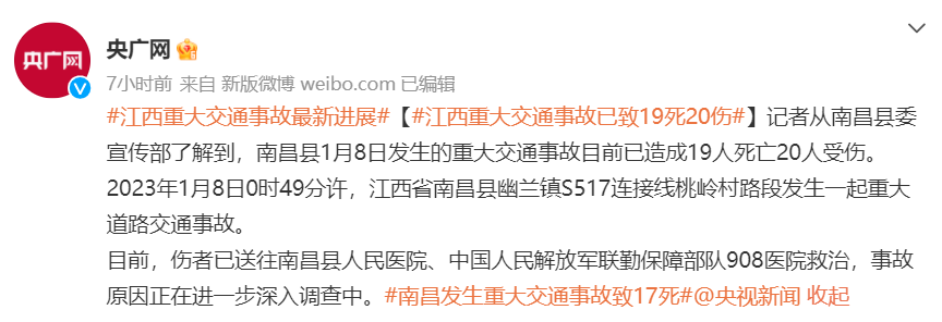 1月8日凌晨,江西南昌縣發生一起重大交通事故,截止1月9日16時,已造成19人死亡21人受傷。當地居民透露,因逝者家屬需早晨5點前到殯儀館排隊拿號,故村民于凌晨出殯,后被貨車撞上送行隊伍造成死傷。