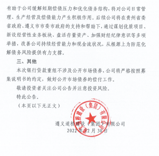 消息一出,震驚了金融圈,“它明明可以不還錢,卻選擇拖20年,可謂是優雅的做老賴了”。盡管此次遵義道橋成功對約156億元銀行債務進行了重組,但截至2022年6月末,遵義道橋的有息負債余額為457.54億元,除去此次重組的155.94億元銀行貸款外,遵義道橋還存在大量信托等非標債務,這部分非標債務如何化解也備受關注。