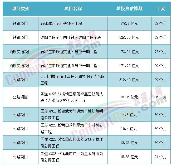 據水泥人網了解,近日,有多個重大項目獲批,其中包括多個鐵路、城軌交通、公路等項目,項目總投資額達1300多億元,其中部分項目中標單位已經確定中鐵建下屬公司。
