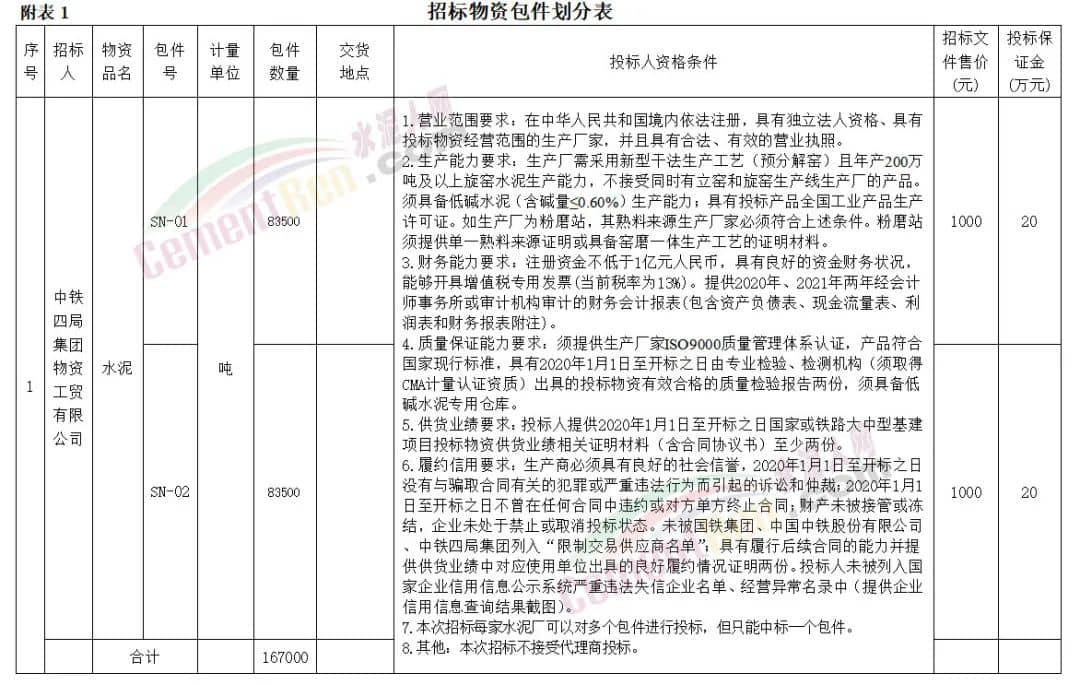 中鐵四局集團有限公司深江鐵路五標項目167000噸水泥采購招標公告中明確投標人生產能力要求生產廠需采用新型干法生產工藝(預分解窯)且年產200萬噸及以上旋窯水泥生產能力,不接受同時有立窯和旋窯生產線生產廠的產品。須具備低堿水泥(含堿量≤0.60%)生產能力;具有投標產品全國工業產品生產許可證。如生產廠為粉磨站,其熟料來源生產廠家必須符合上述條件。粉磨站須提供單一熟料來源證明或具備窯磨一體生產工藝的證明材料,企業須具備低堿水泥專用倉庫。