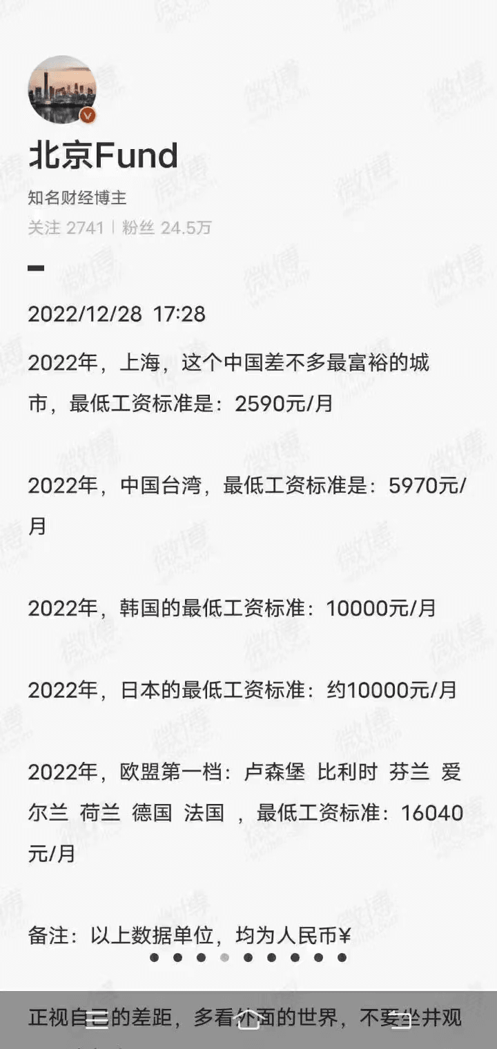日前,知名財(cái)經(jīng)博主北京Fund 在社交媒體發(fā)布了2022年部分國(guó)家和地區(qū)的最低工資標(biāo)準(zhǔn)。其中中國(guó)最富裕的城市上海最低工資標(biāo)準(zhǔn)是2590元/月;中國(guó)臺(tái)灣最低工資標(biāo)準(zhǔn)是5970元/月;韓國(guó)的最低工資標(biāo)準(zhǔn)10000元/月;日本的最低工資標(biāo)準(zhǔn)約10000元/月;歐盟第一檔盧森堡、比利時(shí)、芬蘭、愛(ài)爾蘭、荷蘭、德國(guó)、法國(guó)最低工資標(biāo)準(zhǔn)16040 元/月。