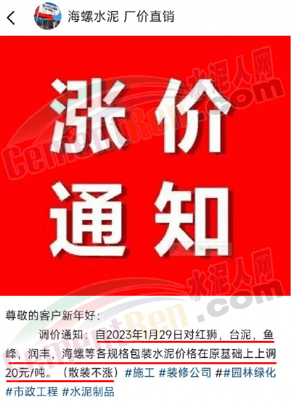 南寧區域水泥經銷商發調價通知稱,自2023年1月29日對紅獅、臺泥、魚峰、潤豐、海螺等各規格包裝水泥價格在原基礎上上調20元/噸,同時提示散裝水泥不漲價。