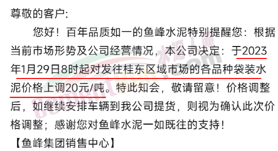魚峰集團銷售中心通知稱,根據當前市場形勢及公司經營情況,公司決定于2023年1月29日8時起對發往桂東區域市場的各品種袋裝水泥價格上調20元/噸。
