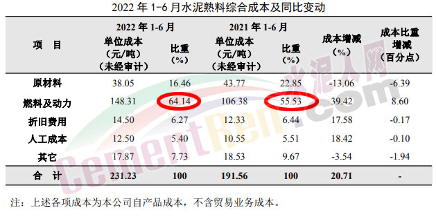 煤價上漲導致包括海螺水泥在內的能源消費大戶成本上漲,海螺水泥2022年半年報顯示,燃料及動力占費用成本的64%,而且呈增長的趨勢。2020年的燃料成本占比為53%,2021年是55%。