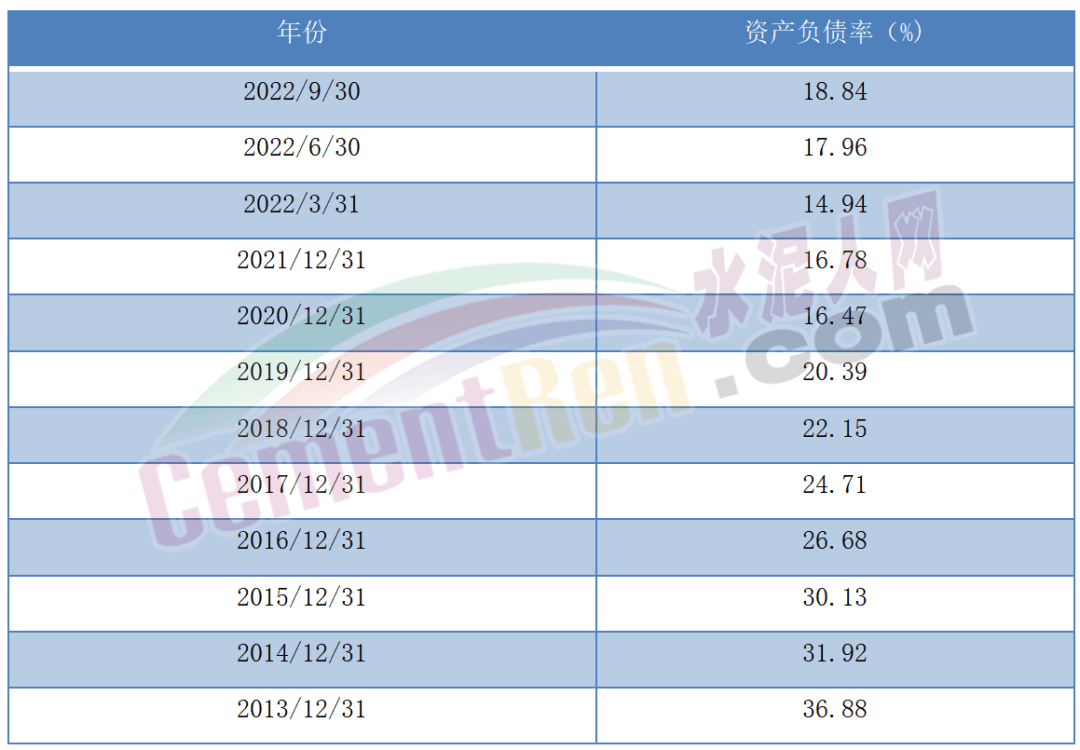從企業資產負債率來看,從2013年開始海螺水泥的資產負債率逐年下降,2022年第三季度僅為18.84%,作為一個重資產的水泥企業,市值過千億,這么低的負債實屬不易。