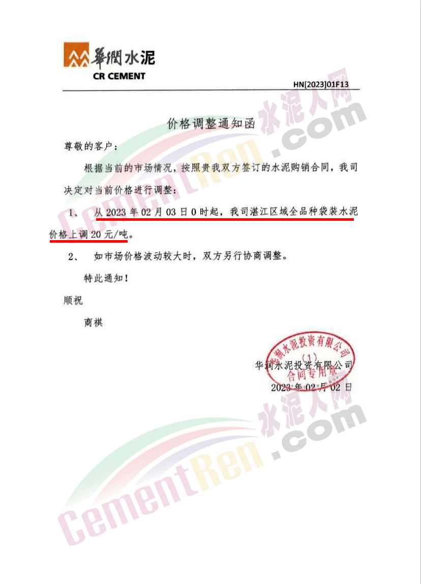 同日,華潤水泥通知根據(jù)當(dāng)前的市場情況,從2月3日0時起,公司湛江區(qū)域全品種袋裝水泥上調(diào)20元/噸。
