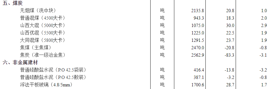 國家統(tǒng)計局近期公布數(shù)據(jù)可見,4500~5800大卡煤炭價格在943元/噸~1291元/噸。同比一月上旬仍有1.9%~2%的漲幅。同期普通硅酸鹽水泥P.O42.5袋裝和散裝報價分別為416.4元/噸和387.1元/噸,同比一月上旬分別下跌13.8元/噸和3.2元/噸,跌幅3.2%和0.8%。