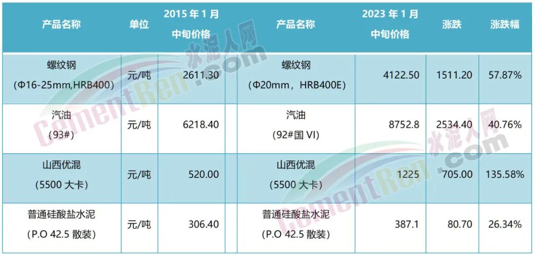 從國家統(tǒng)計局數(shù)據(jù)可見,煤炭漲價,水泥跌價是近幾年來的普遍趨勢。2015年1月中旬至今5500大卡煤炭上漲了705元/噸,漲幅135.58%,而P.O42.5散裝水泥上漲了80.70元/噸,上漲僅26.34%。2015年煤價是水泥價格的1.7倍,2023年1月中旬煤炭價格是水泥價格的3.16倍。