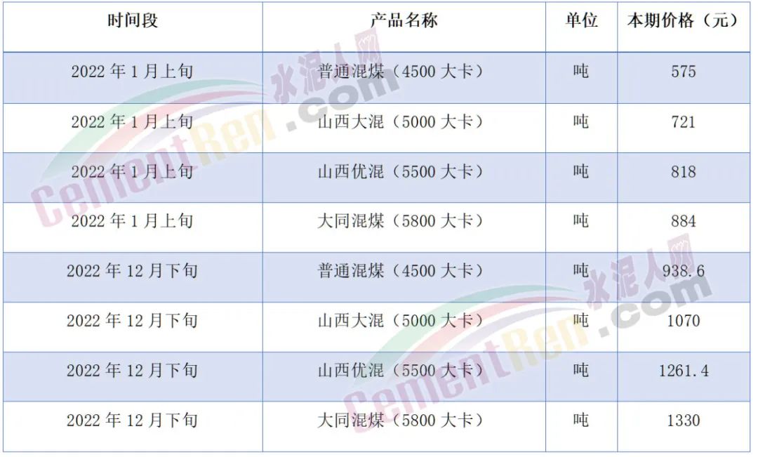 從2022年統(tǒng)計數(shù)據(jù)來看2022年1月上旬至12月下旬期間,4500大卡煤炭價格上漲了363.6元/噸,漲幅63.23%;5000大卡煤炭價格上漲了349元/噸,漲幅48.4%;5500大卡煤炭價格上漲了443.4元/噸,漲幅54.2%;5800大卡煤炭價格上漲了446元/噸,漲幅50.45%。