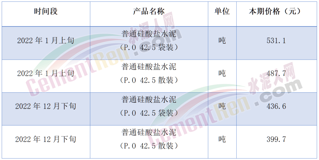 以5500大卡煤炭為例,近三年最高價為2021年10月中旬的報價1820.6元/噸,較當(dāng)年10月上旬上漲422.3元/噸;最高環(huán)比漲幅為2022年3月上旬,報價1338.1元/噸,較當(dāng)年2月下旬漲32.2%。PO42.5散裝水泥2022年內(nèi)最低價為2022年7月下旬報364.2元/噸,最高價為2022年1月上旬,報487.7元/噸。