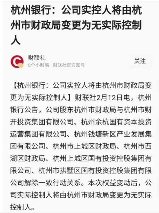 日前,杭州銀行公告,公司股東杭州市財政局與杭州市財開投資集團有限公司、杭州余杭國有資本投資運營集團有限公司、杭州錢塘新區(qū)產(chǎn)業(yè)發(fā)展集團有限公司、杭州市上城區(qū)財政局、杭州市西湖區(qū)財政局、杭州上城區(qū)國有投資控股集團有限公司、杭州市拱墅區(qū)國有投資控股集團有限公司解除一致行動關(guān)系。本次權(quán)益變動后,公司實際控制人將由杭州市財政局變更為無實際控制人。