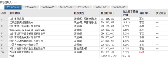 2022年3月,杭州銀行原第一大股東澳洲聯(lián)邦銀行將其所持有的5.94億股(持股比例10%)轉(zhuǎn)讓給杭州城投、杭州交投,于是原第二大股東杭州市財政局被動成為第一大股東。
