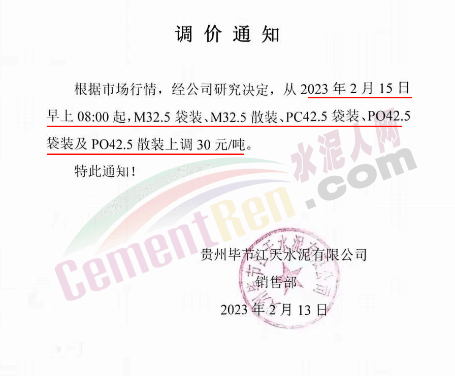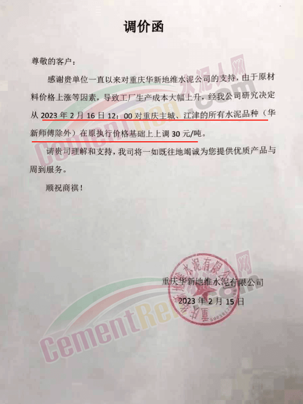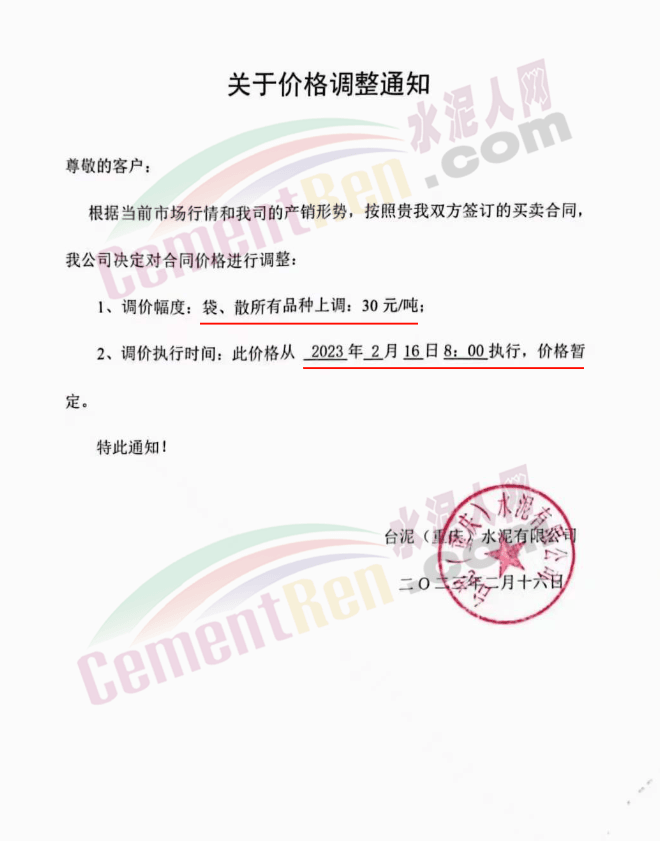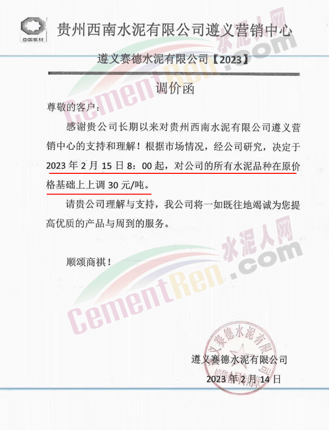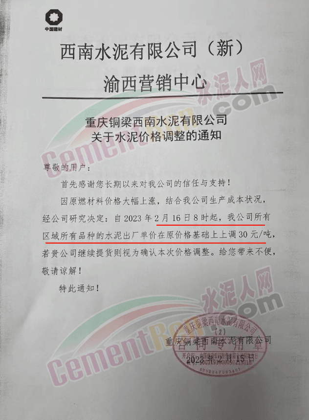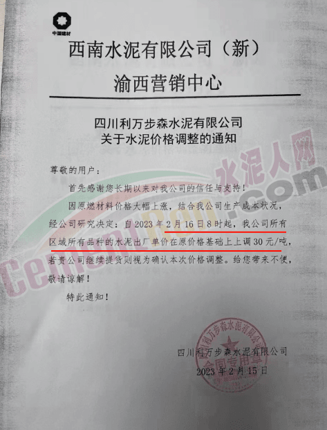 水泥人網通訊員消息,近日 ,西南地區四川、重慶、貴州多地主要品牌企業通知上調水泥價格20-30元/噸。