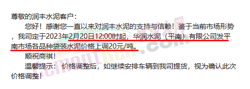 海螺水泥通知,于2月20日0時起,對廣西區域全品項水泥價格上調20元/噸。并提示,價格調整后,若繼續安排車輛提貨,視為確認此次價格調整。