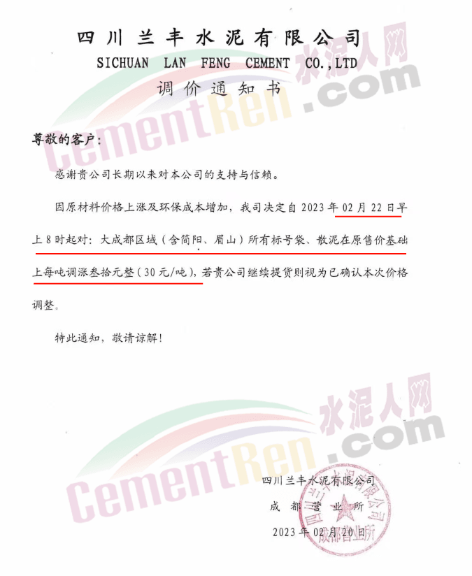 同期,四川蘭豐水泥、亞東水泥分別通知,2月22日早8時起,大成都區域所有標號水泥上調30元/噸。