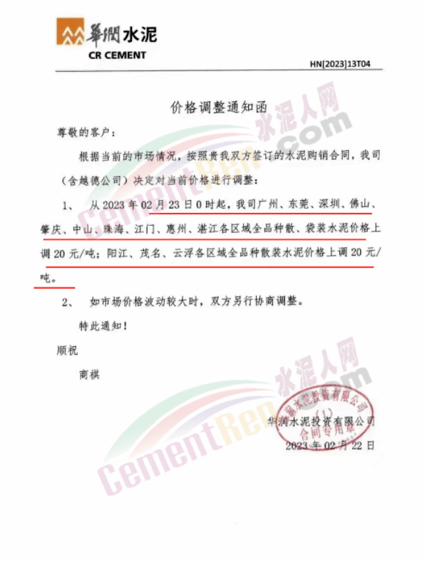 廣東區(qū)域華潤(rùn)水泥投資有限公司從2023年2月23日0時(shí)起對(duì)發(fā)往以下的區(qū)域的水泥價(jià)格進(jìn)行調(diào)整。