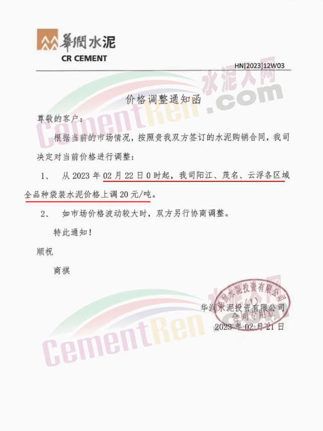 華潤(rùn)水泥(平南)有限公司通知,定于2023年2月20日12:00時(shí)起發(fā)平南市場(chǎng)各品種袋裝水泥價(jià)格上調(diào)20元/噸。