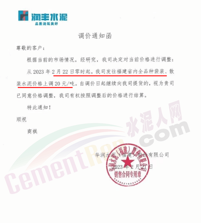 華潤(rùn)水泥(福建)股份有限公司通知,2月22日零時(shí)起,公司發(fā)往福建省內(nèi)全品種袋裝、散裝水泥價(jià)格上調(diào)20元/噸。