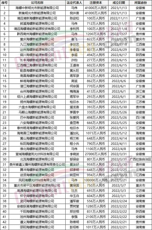 據不完全統計,海螺水泥近一年來已注冊成立40多家新能源公司。