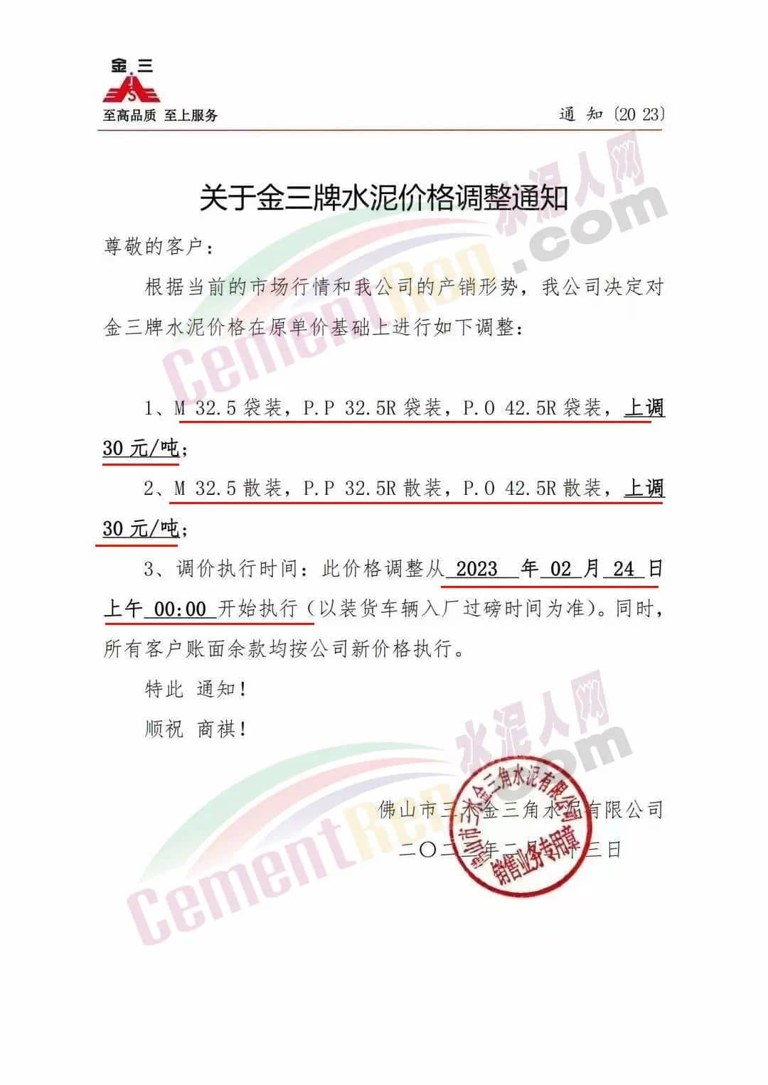 佛山市金三角水泥有限公司通知根據當前的市場行情和公司的產銷形勢,決定從2月24日0時起對M32.5袋裝,PP32.5R袋裝,P.O42.5R袋裝,上調30元/噸;M32.5散裝,P.P32.5R散裝,P.O42.5R散裝,上調30元/噸。