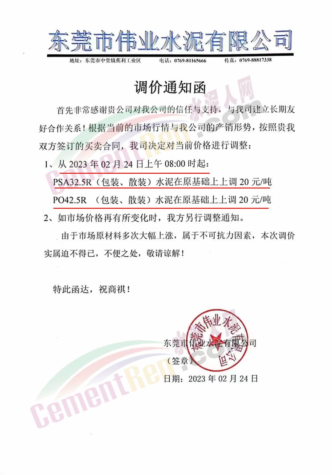 東莞市偉業水泥有限公司通知,根據當前的市場行情與公司的產銷形勢,決定從2023年2月24 日上午8時起PSA32.5R(包裝、散裝)水泥在原基礎上上調20元/噸;PO42.5R(包裝、散裝)水泥在原基礎上上調20元/噸。
