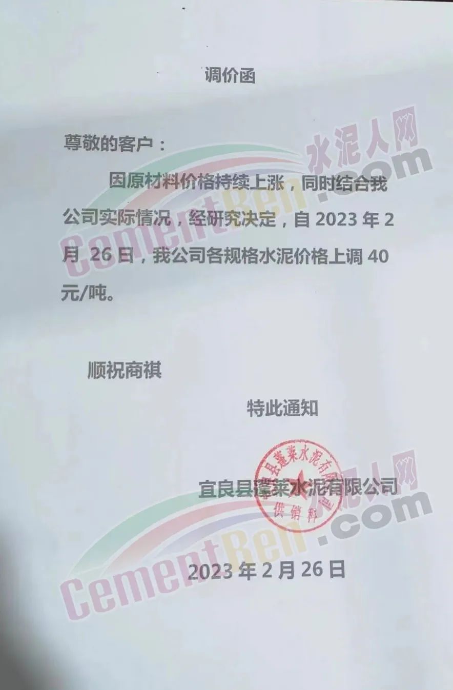 宜良縣蓬萊水泥有限公司通知,因原材料價格持續上漲,同時結合公司實際情況,經研究決定,自 2023 年2月 26 日,各規格水泥價格上調40元/噸。
