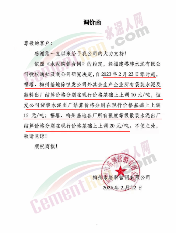 水泥人網(wǎng)通訊員消息,日前梅州市塔牌管銷有限公司通知,自2023年2月28日零時(shí)起,梅州基地金塔公司、恒塔公司所有袋裝PP325水泥結(jié)算價(jià)格分別在現(xiàn)行價(jià)格基礎(chǔ)上上調(diào)10元/噸;恒塔公司袋裝PP32.5R水泥結(jié)算價(jià)格在現(xiàn)行價(jià)格基礎(chǔ)上上調(diào)5元/噸;恒發(fā)公司所有水泥出廠結(jié)算價(jià)格分別在現(xiàn)行價(jià)格基礎(chǔ)上上調(diào)10元/噸。