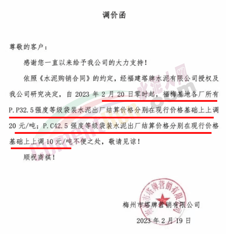 2月20日:福梅基地各廠所有P.P32.5強(qiáng)度等級(jí)袋裝水泥出廠結(jié)算價(jià)格分別在現(xiàn)行價(jià)格基礎(chǔ)上上調(diào)20元/噸;PC42.5等級(jí)袋裝水泥出廠結(jié)算價(jià)格分別在現(xiàn)行價(jià)格基礎(chǔ)上上調(diào)10元/噸。