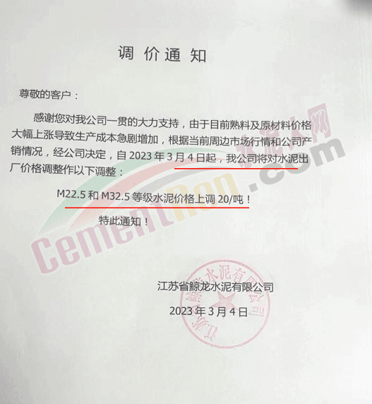 江蘇省鯨龍水泥有限公司通知,由于目前熟料及原材料價格大幅上漲導致生產成本急劇增加,根據當前周邊市場行情和公司產銷情況,經公司決定,自2023年3月4日起對M22.5和M32.5等級水泥價格上調20元/噸。