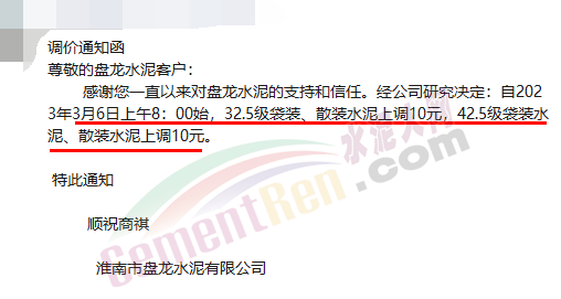 淮南市盤龍水泥、淮南禹山水泥公司、淮礦水泥廠、沿淮水泥廠通知,自3月6日起,水泥價格上調10元/噸。