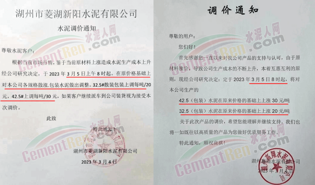 3月5日前后,海螺水泥經銷商通知,發往溫州市場水泥價格上調20-30元/噸,其中M32.5包裝水泥上調20元/噸、P.O42.5袋裝水泥上調30元/噸。
