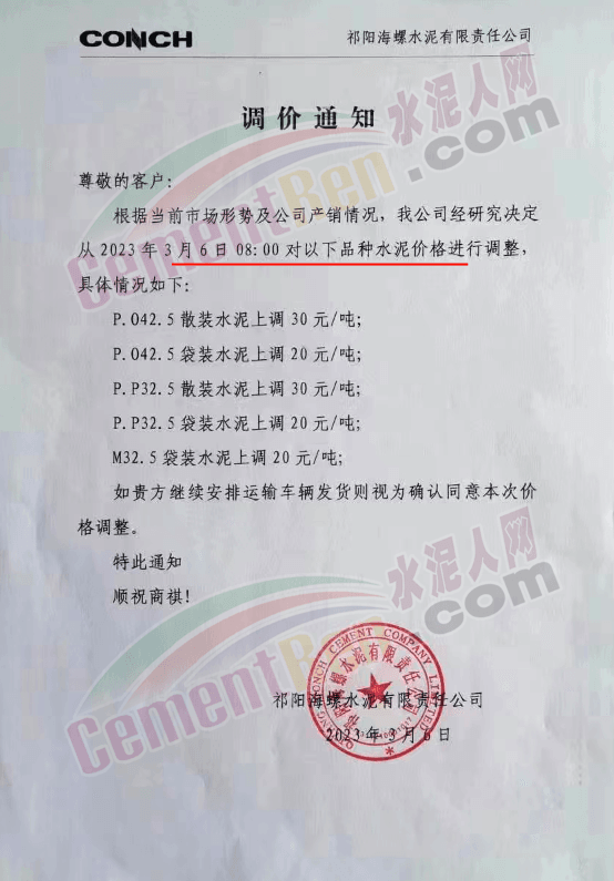 祁陽海螺水泥有限責任公司通知,根據當前市場形勢及公司產銷情況,公司經研究決定從2023年3月6日8時起對各標號水泥上調20-30元/噸。
