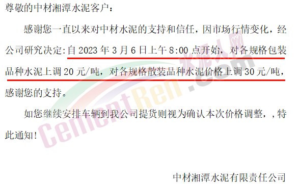 湖南中材湘潭水泥有限責任公司通知,3月6日上午8時起,各規格包裝水泥上調20元/噸,散裝水泥上調30元/噸。