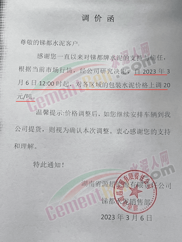 湖南省源超能源有限責任公司銻都水泥銷售部通知,根據當前市場行情,經公司研究決定,自2023年3月6日12:00時起,對各區域的包裝水泥價格上調20元/噸。