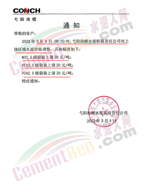 江西弋陽海螺水泥通知,3月4日起對上饒區域水泥價格20元/噸。