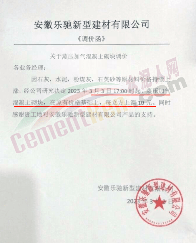安徽樂馳新型建材有限公司通知,因石灰,水泥,粉煤灰,石英砂等原材料價格持續上漲,經公司研究決定2023年3月3日17時起,蒸壓加氣混凝土砌塊,在原有價格基礎上每立方上調10元。