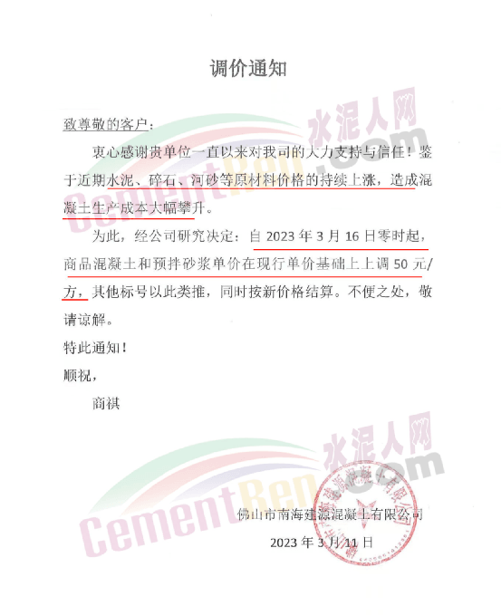 3月11日佛山市南海區泌沖水泥混凝土有限公司、佛山市南海建源混凝土有限公司發調價通知稱,鑒于近期水泥、碎石、河砂等原材料價格的持續上漲,造成混凝土生產成本大幅攀升。經公司研究決定:自2023年3月16日零時起商品混凝土和預拌砂漿單價在現行單價基礎上上調50元/方,其他標號以此類推,同時按新價格結算。