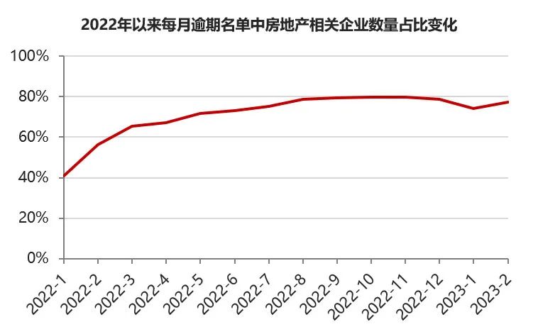上海票交所發布《截至2023年2月28日承兌人逾期名單》顯示,承兌人逾期名單企業為1810家,其中房地產相關企業總計1400家(房地產、建筑、租賃和商務服務業),占當月逾期企業數量(1810家)的77%。按照規則,上海票交所將暫停這1810家企業的承兌功能。