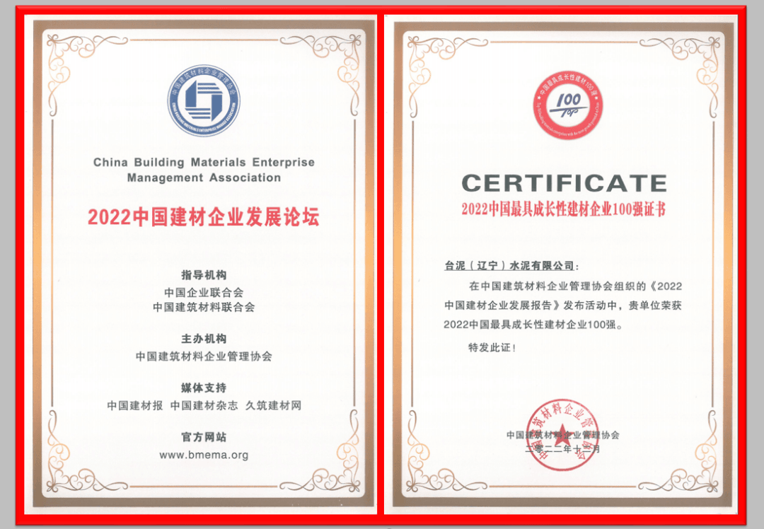 會上,臺泥(遼寧)水泥有限公司榮獲“2022中國最具成長性建材企業100強”殊榮。