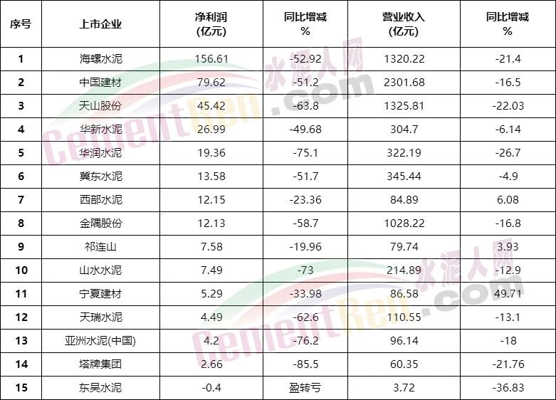 2022年上市水泥企業(yè)凈利潤和營收情況一覽