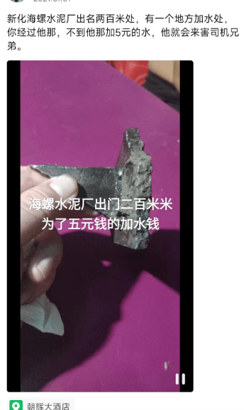 新化海螺水泥廠,有個地方加水處,經過他那里不加5元的水,他就會來害司機兄弟……