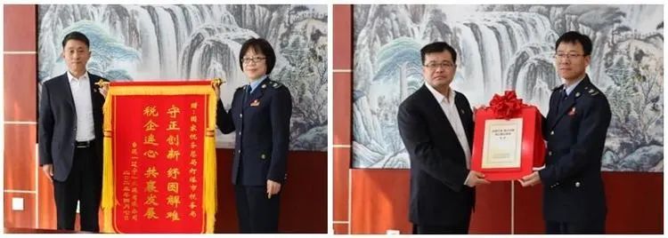 金隅冀東水泥遼寧區(qū)域黨委書記閆海峰向燈塔市稅務(wù)局贈(zèng)送錦旗,燈塔市稅務(wù)局副局長張毅向臺(tái)泥(遼寧)水泥有限公司贈(zèng)送稅收宣傳資料。