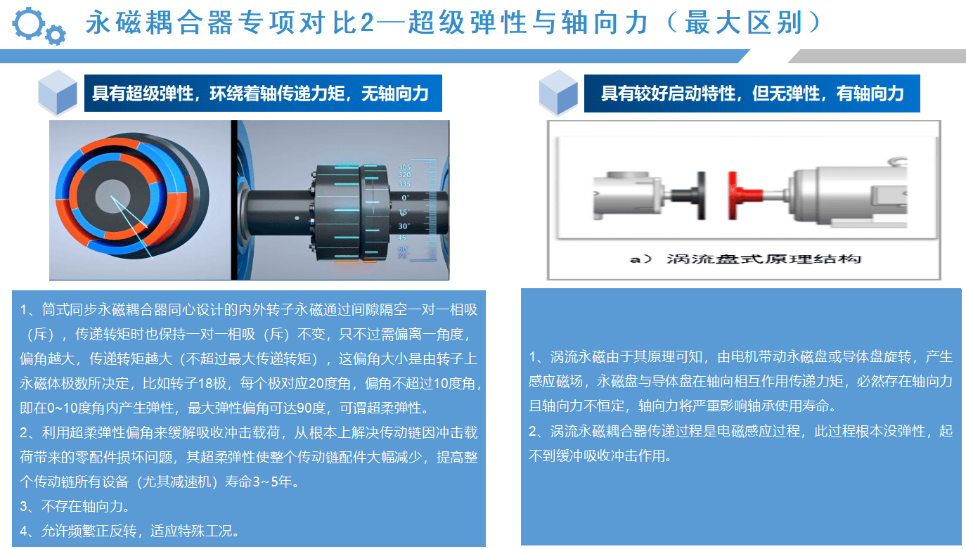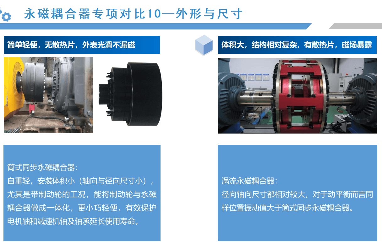 從以上的應用案例來看,同步永磁耦合器的應用效果會比較明顯,接下來,我們通過數據對比的形式,具體分析筒式同步全永磁耦合器與渦流永磁耦合器優劣勢: