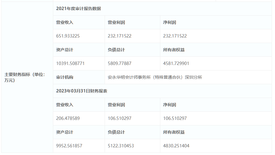 披露信息中提到的企業(yè)主要財(cái)務(wù)指標(biāo)顯示,2021年度企業(yè)利潤總額達(dá)232.17萬元,資產(chǎn)總計(jì)達(dá)1.039億元,當(dāng)年?duì)I業(yè)收入651.93萬元,凈利潤232.17萬元,負(fù)債總計(jì)5809.77887萬元。2023年03月31日財(cái)務(wù)報(bào)表資產(chǎn)總計(jì)約9952.561857萬元,營業(yè)收入206.478589萬元,凈利潤106.510297萬元,負(fù)債總計(jì)5122.310453萬元。