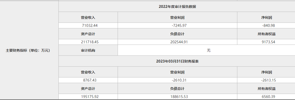 企業(yè)2023年3月31日財(cái)務(wù)報(bào)表顯示,資產(chǎn)總計(jì)195175.92萬元,負(fù)債總計(jì)188615.53萬元,所有者權(quán)益6560.39萬元,營業(yè)收入8767.43萬元,營業(yè)利潤-2612.68萬元,凈利潤-2613.15萬元。