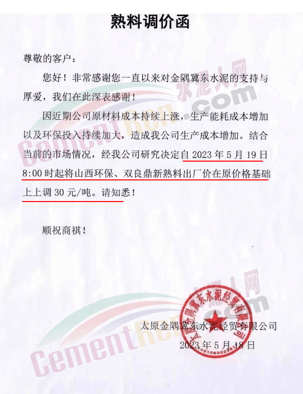 晉中同力達水泥銷售處通知,因近期公司原材料成本持續上漲,生產能耗成本增加以及環保投入持續加大,造成公司生產成本增加。結合當前的市場情況,經公司研究決定自5月19日8時起將熟料出廠價在原價格基礎上上調30元/噸。