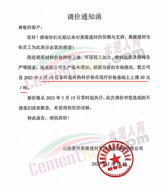 山西晉興奧隆建材有限責任公司銷售公司通知,因近期原材料價格持續上漲、環保投入加大、能耗雙控及錯峰生產等因素,造成公司生產成本增加。根據當前的市場情況,公司自2023年5月19日零時起將熟料價格在現行價格基礎上上調30元/噸。