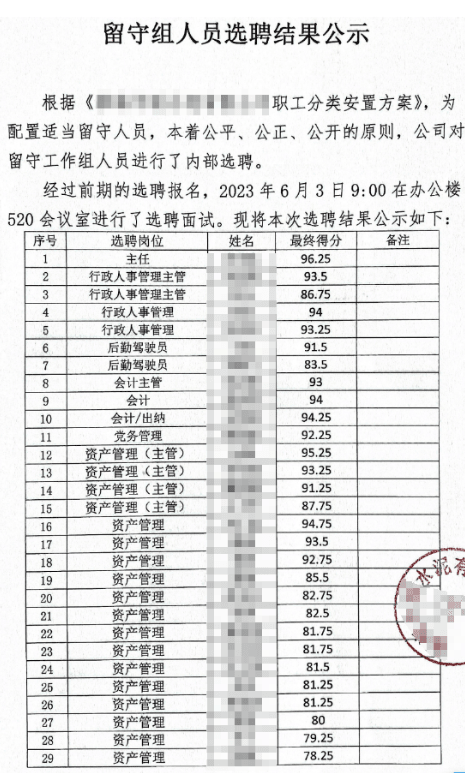 企業(yè)發(fā)布的《留守組人員選聘結(jié)果公示》顯示,經(jīng)過前期的選聘報名、面試共有29人留守。選聘崗位分別為行政人事管理、后勤駕駛員、會計、出納、黨務(wù)管理、資產(chǎn)管理等。